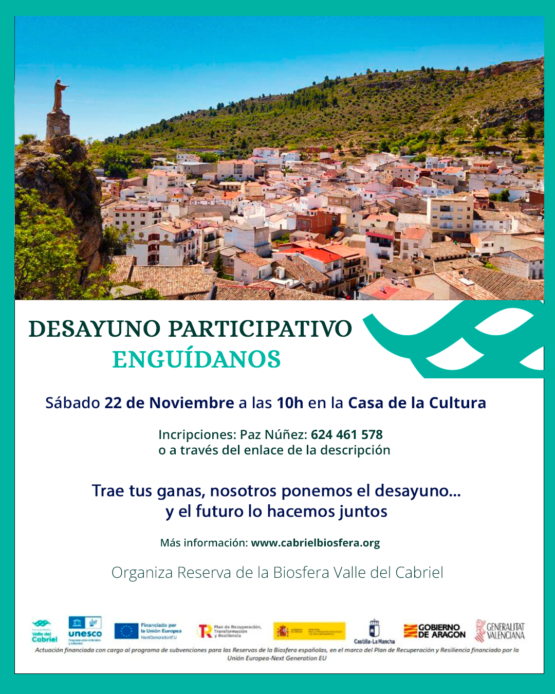 Desde la Reserva de la Biosfera Valle del Cabriel te invitamos a una pasar una mañana diferente en la que, de manera sencilla y cercana, vamos a reflexionar juntos sobre lo que hace especial a nuestro territorio y qué cosas nos gustaría mejorar. Queremos escuchar lo que normalmente comentamos en el bar, en la calle o en la plaza… pero esta vez con la oportunidad de que esas ideas y propuestas queden recogidas para el diagnóstico y el Plan de Gestión de la Reserva de la Biosfera.